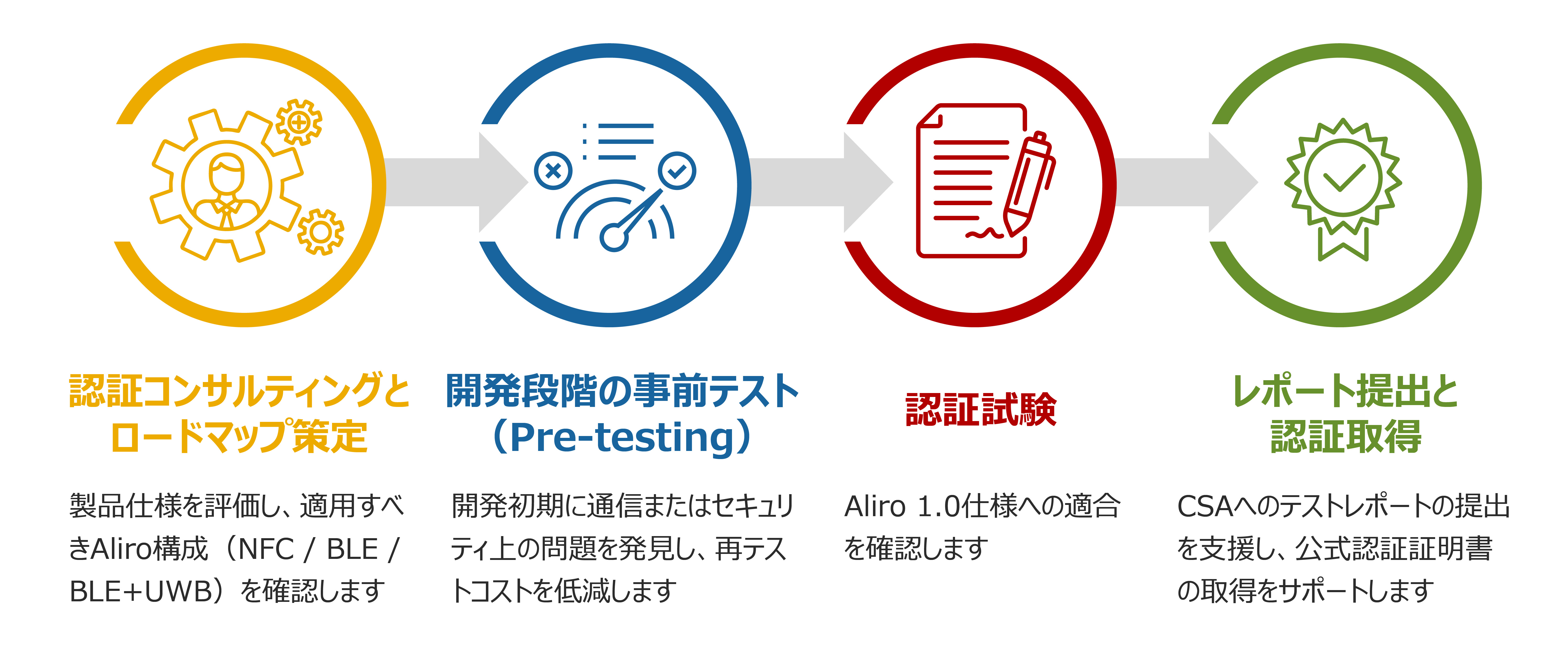 • ワンストップソリューション:MatterからAliro、NFCやBluetooth認証まで、IoT分野のクロス標準統合テストサービスを提供しています。