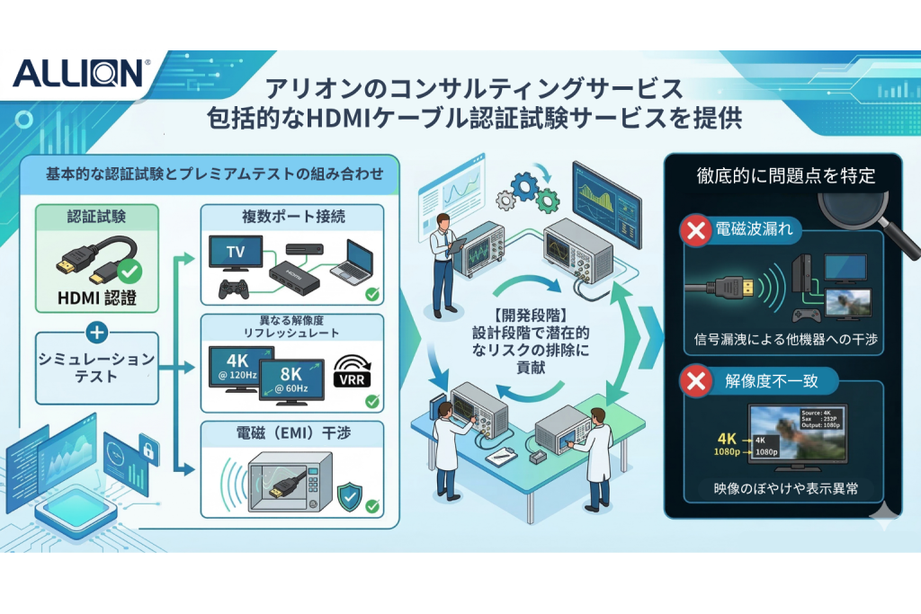- 低周波帯のリスク:アリオンの知見によれば、ケーブルは特に185MHz帯(1080P@60Hzに対応)で問題が発生しやすいことが分かりました。つまり、一般的な規格のケーブルでもEMI試験が行われていない場合、高い干渉リスクが存在します。