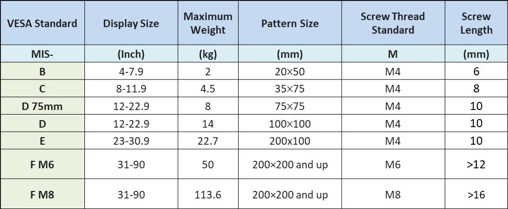 VESAマウント規格では、それぞれ異なるディスプレイサイズと重量に対する規格が定められています